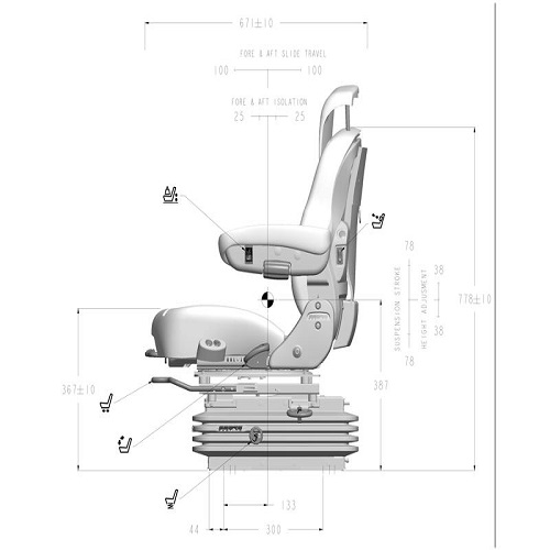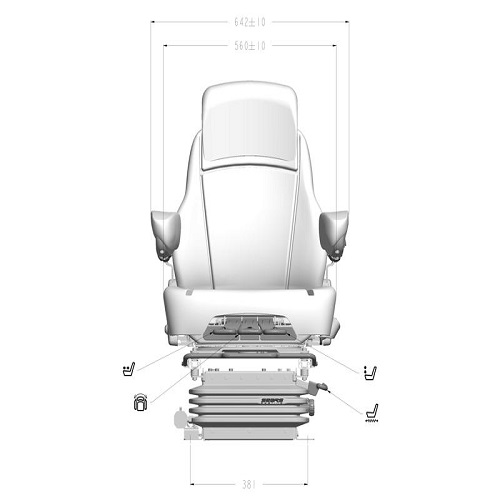 Features-Double depth cut & sew luxury fabric, comfort cushions Backrest Tilt Backrest Extension Electrical Lumbar Adjustment Seat Cushion Length & Angle Adjustment Armrests with height pitch & tilt up adjustment Heated Operator presence switch Document Pouch Swivel 24° – 24° Automatic height adjustment Suspension stroke +/- 78mm Fore – aft side travel of 200mm Ajustable shock absorber Horizontal isolator fully integrated, sprung & Duo® Damped Adjustable Duo® damper Vibration performance to ISO 7096 Supplied with multifix mounting kit